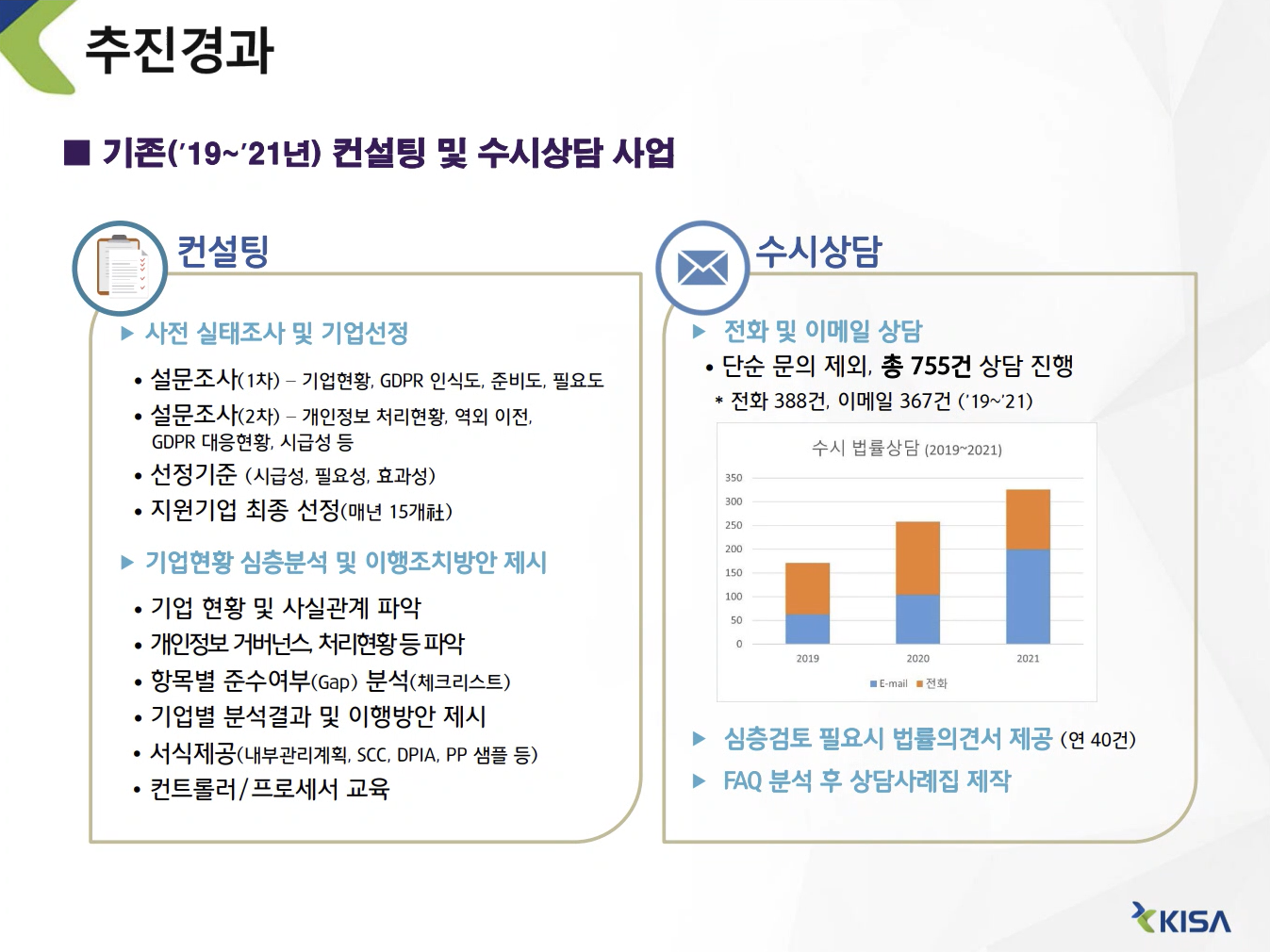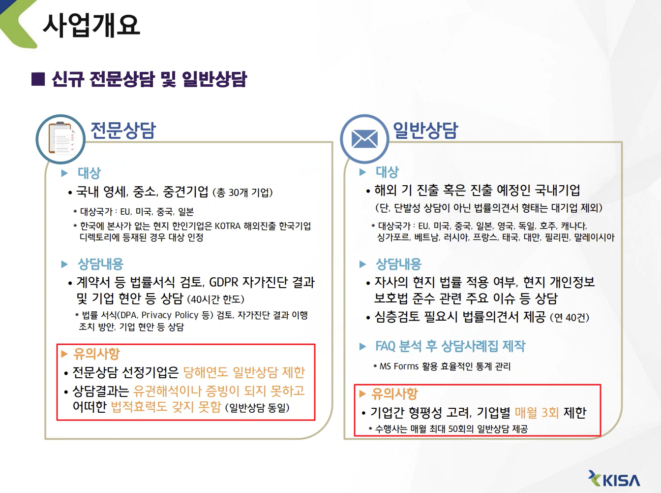 : 주요국 개인정보보호 법률에 대한 상담을 통하여 우리기업의 해당 규제 준수지원 및 해당권역 진출기회 확대